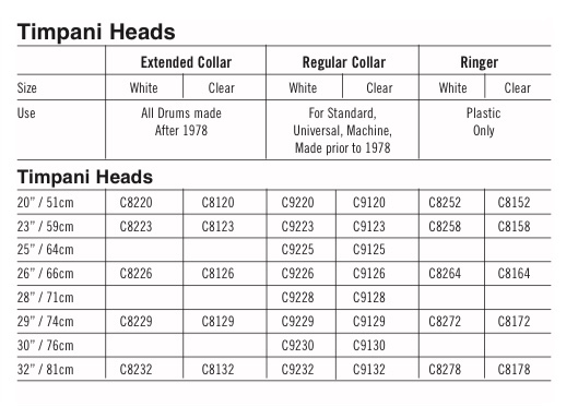 Timpani heads are categorized in two types; standard and extended. Standard heads measure 1” larger than the bowl, while extended heads are 2” larger. Most modern timpani will use extended sizes.