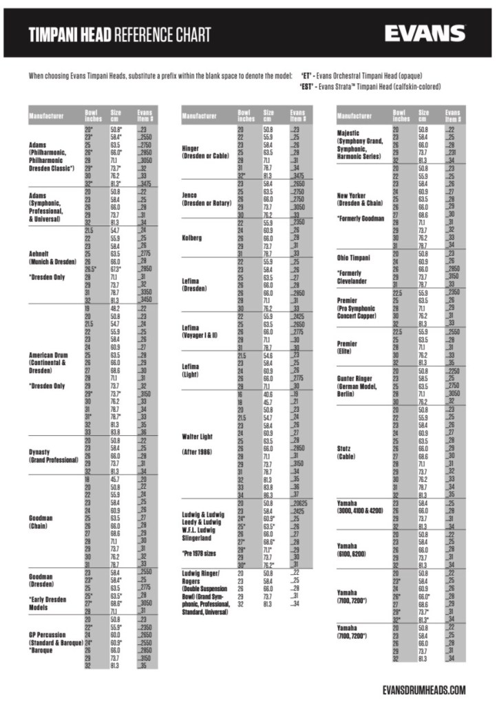 Too often I’ve watched people buy timpani heads assuming you buy it based on the size of the drum shell/bowl (32, 29, 26, 23, or 20”). Timpani heads are different, as they are larger to allow for the heads to stretch over the edge of the bowl.