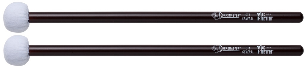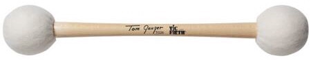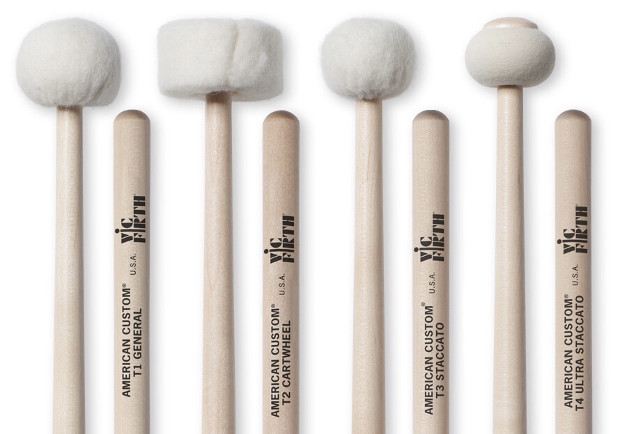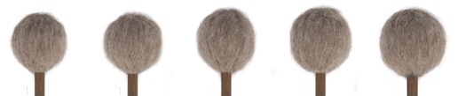 There are generally two design of felt-headed mallets; parachute and cartwheel. The parachute style is more common for mass produced mallets and looks like a small felt ball wrapped around the end of the mallet and tied where the mallet meets the handle. Cartwheel mallets, as the name implies, looks like a wheel. These mallets are more difficult to play for beginners, as there is always a seam stitched on one side. This seam creates a harder surface and can interfere with a consistent, quality tone. Some players will use a marker to identify this seam, so as to aid in avoiding that surface. Parachute wrapped heads avoid this issue, and thus I recommend this style for younger players. As with other mallets, I recommend starting with a medium or general mallet. Vic Firth’s Corpsmaster series of mallets incorporate synthetic felt heads. While the handles are larger, I have been recommending these for younger programs, budget minded programs, and schools that do not take care of their equipment. Any other synthetic headed timpani mallets would work as well, but are not common.