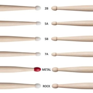 Anything goes. The classic 5A is, hands down, the most popular stick size for drum set playing. This model, which varies slightly from brand to brand, is perfect for beginners playing any style of music. One might think since this covers so many styles of music, that it will work as a general purpose stick. It does not work well for beginners playing concert drums due to the lack of mass to easily articulate grace notes and rolls. With the huge variety of signature sticks and special designs on the market, students have many options. When I doubt, I always recommend starting with the classic sizes; 7A, 5A, 5B, 2B; thin to thick, respectively. Wood or nylon tip is purely personal preference for beginners. As we advance and learn about the sound we are producing, that can change. Nylon tips are more durable than wood and will sound noticeably brighter, while wood tips sound more mellow.