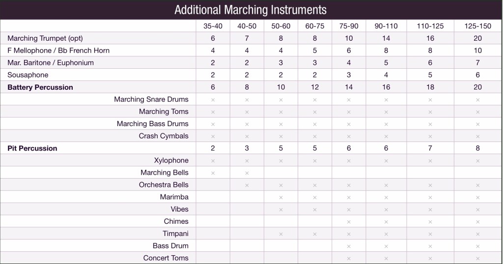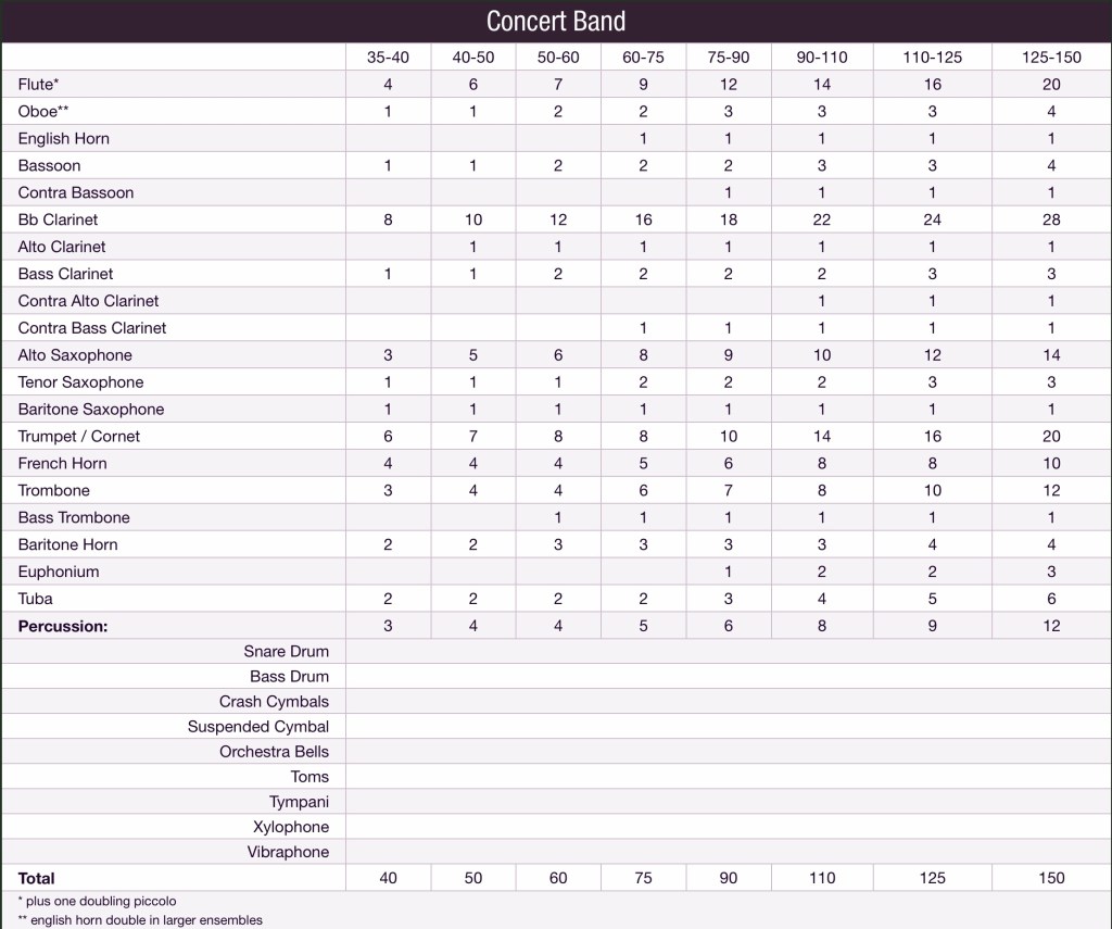 Instrumental music programs never have the luxury of perfect instrumentation. Some schools have a large enough student population that minor variations of instrumentation will not affect them long term. Others are small and just happy they have student interest in playing anything and will make any instrumentation work. Strategies abound to encourage a balanced ensemble. I will not be discussing them here.